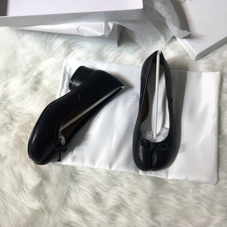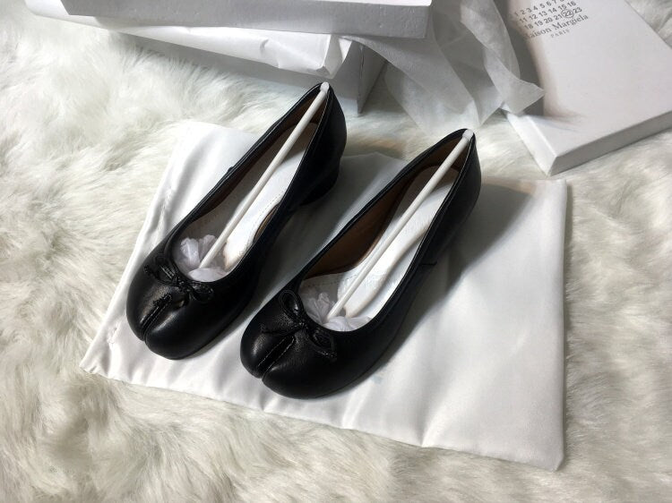 Handmade Women Black 3.5cm Heel Leather Tabi Shoes,Split Toe shoes,Women's Leather Heel Shoes, Personal Women's Black Slip Ons
